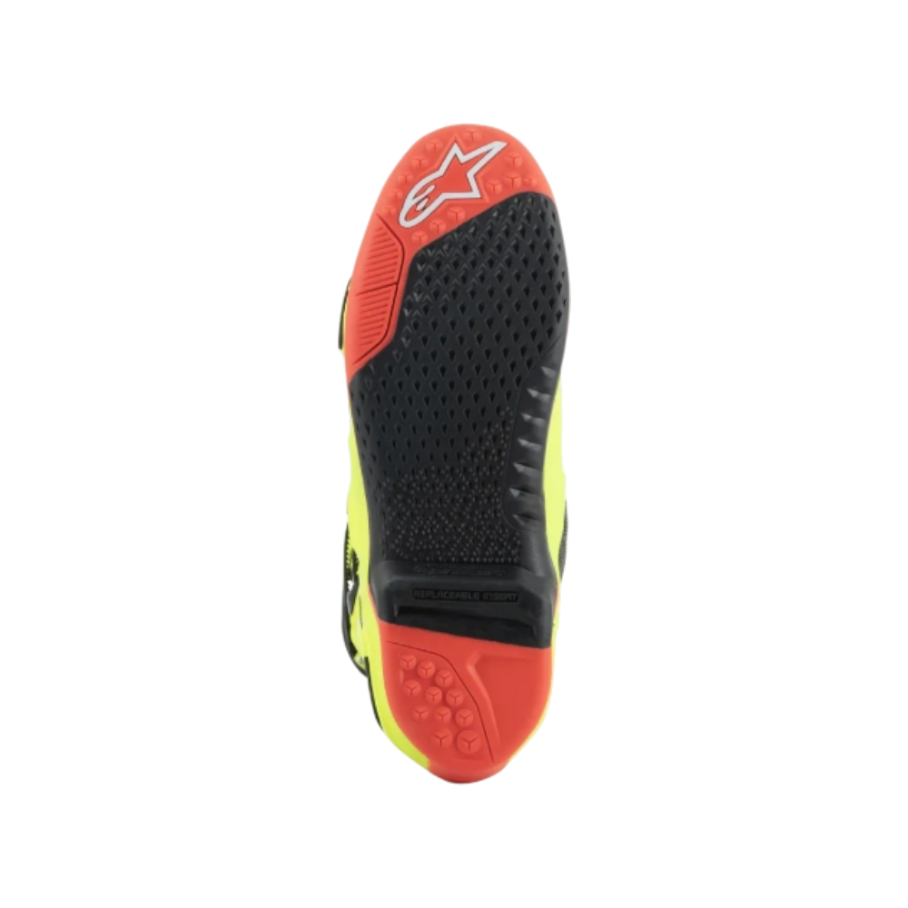 - La plantilla central cuenta con microagarre y diseño de enganche lateral. Es fácilmente reemplazable y Alpinestars ofrece un servicio completo de reemplazo de suela y reparación de botas.